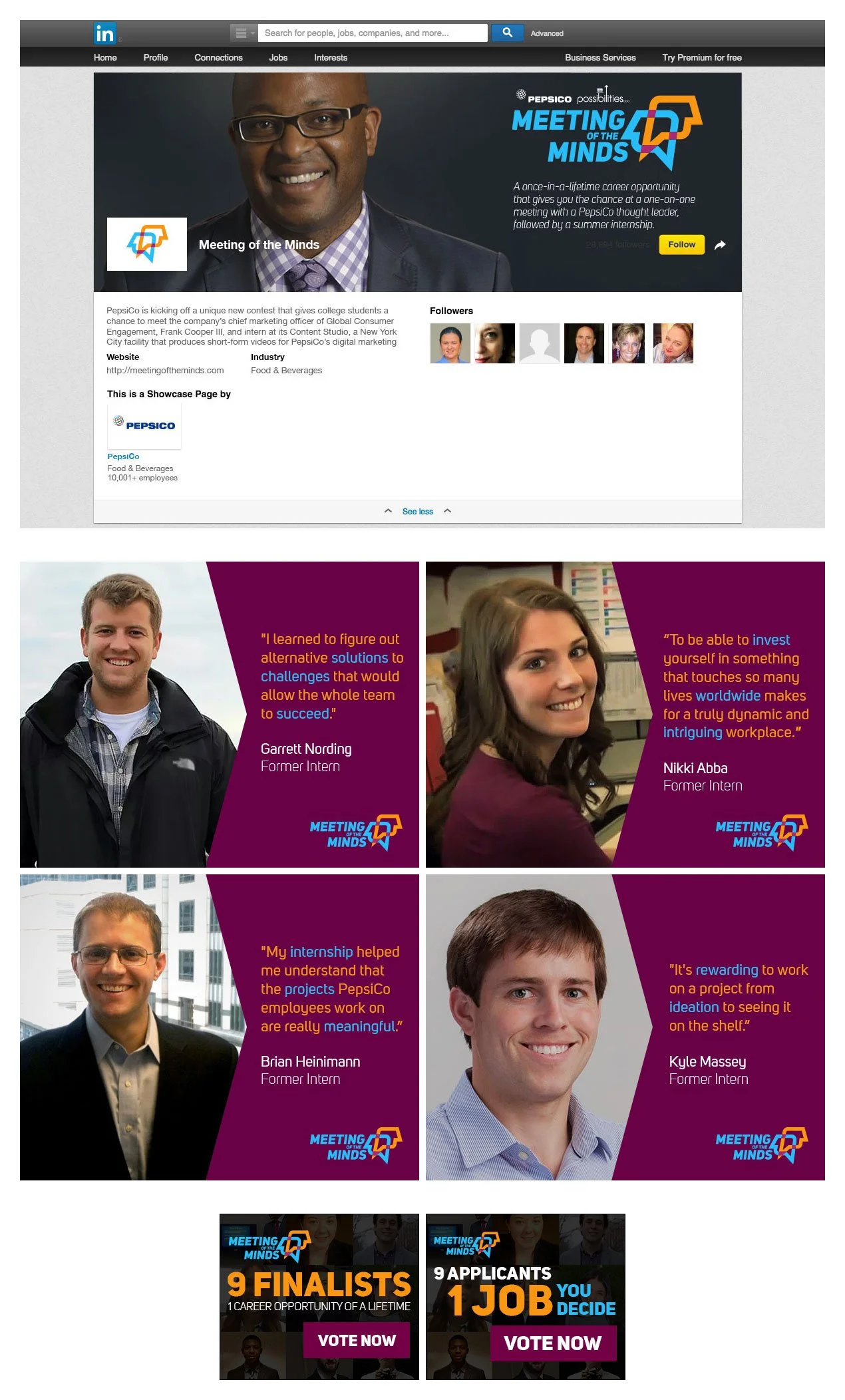 Design website and create digital collateral for PepsiCo’s Meeting of the Minds campaign with an ACD at The Barbarian Group. MOTM is a unique contest that gives college students a chance to meet the company’s (now former) CMO of Global Consumer Engagement, Frank Cooper III, and intern at its Content Studio. Contestants submit a :60 video pitch then nine finalists are selected and the public gets to decide who the lucky winner is.